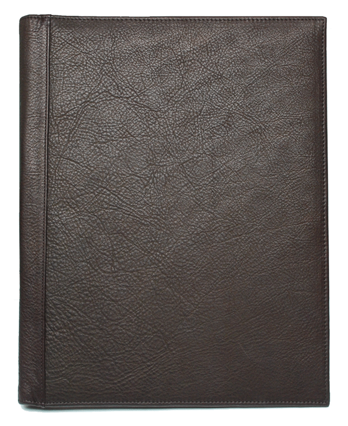 Features : Top-grain leather, with completely hand stitched and turned edges and foam-padded leather covers. Has a pen slot, interior pockets, and a document flap. Both top-loading and side-loading slots on the right pocket.